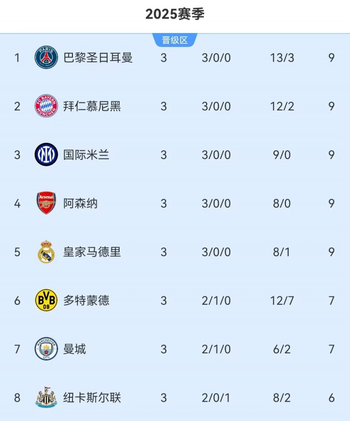 不过,欧冠3轮后与纽卡同积6分的还有巴萨、利物浦、切尔西等6支球队,纽卡因净胜球优势排名领先。